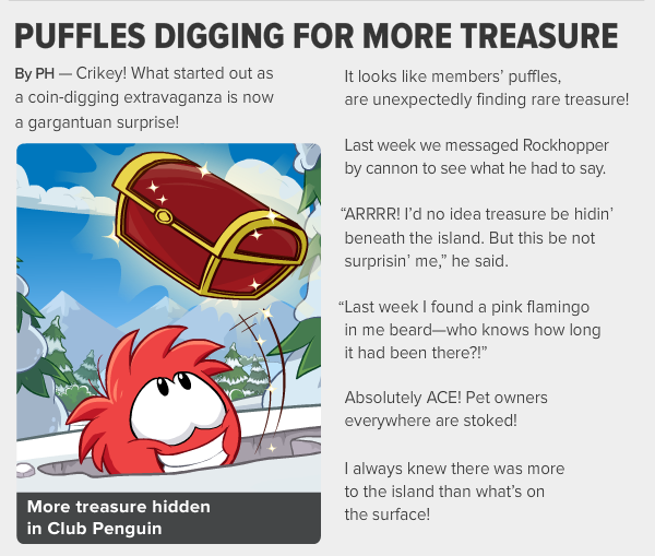 In the article below, some more news about Puffle Digging has been announced. Member puffles can now dig for rare items! - wow! Hmm, I wonder if Club Penguin hid a Blue Lei somewhere around the island. Get your puffle and start digging; you'll find out eventually! Happy digging!